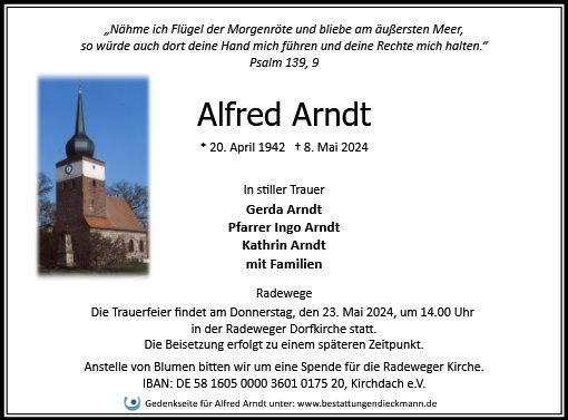 leider kann ich infolge einer gestern Abend zeitgleich angekündigten Warenlieferung aus dem Ausland nicht persönlich an der Trauerfeier teilnehmen. Wir möchten Ihnen hiermit unser herzliches Beileid zum Ableben des Verstorbenen aussprechen. In der Wendezeit haben wir uns näher kennen gelernt und während meiner Zeit im 1. Brandenburger Landtag war Alfred mein Mitarbeiter hier in Brandenburg. Hierfür sage ich Danke ! In dieser Umbruchzeit, an die ich mich gern erinnere, hat uns alle der innere Wille vereint, die verkrusteten und ineffektiven Strukturen zu verändern. Daran konnten wir mitwirken und dafür sollten wir dankbar sein.