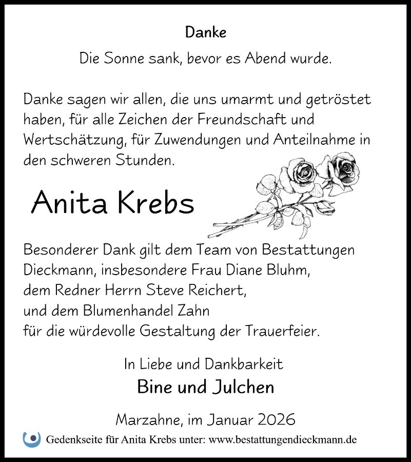 Liebe Familie, wir möchten unser tiefes Mitgefühl zum Tod von Anita aussprechen. Wir wünschen viel Kraft für die kommende Zeit.