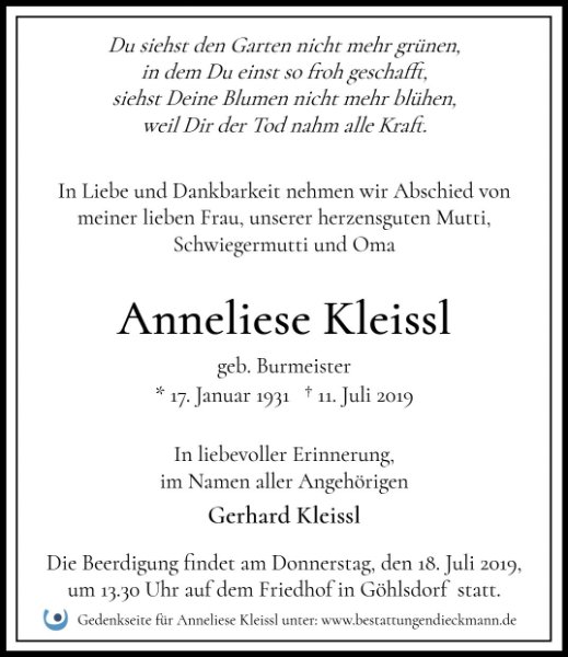 Anneliese Kleisslgestorben am 11. Juli 2019