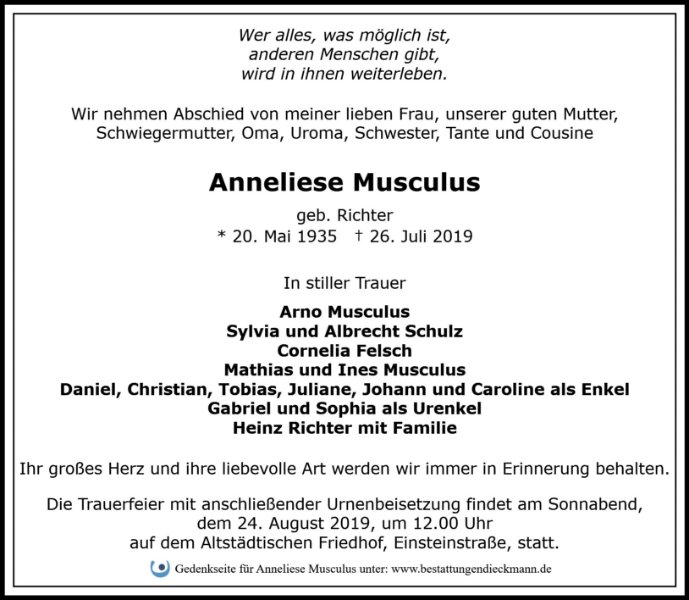 Anneliese Musculusgestorben am 26. Juli 2019