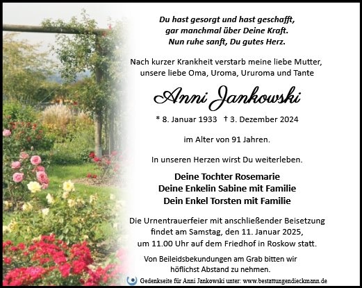 wir wünschen Ihnen für die kommende Zeit viel Kraft und dass es Ihnen gelingt, dankbar auf die positiven Erinnerungen zurückzublicken. Diese Gedenkseite möge Ihnen dabei helfen, Ihre Trauer zu teilen und das Andenken gemeinsam wachzuhalten.