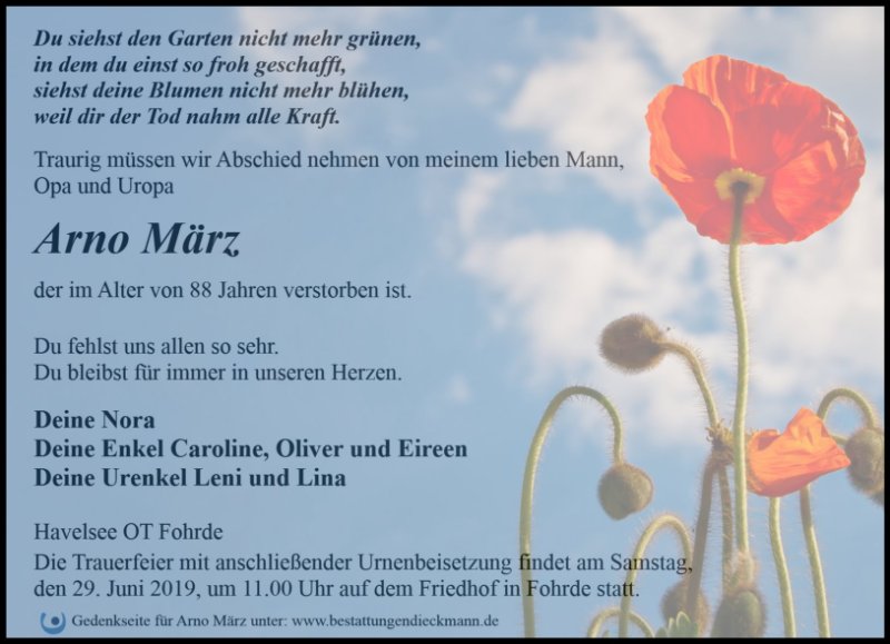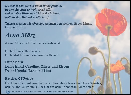 wir wünschen Ihnen von Herzen viel Kraft, dass Sie Menschen um sich haben, die Ihnen in dieser schweren Zeit beistehen und Halt geben. Zusätzlich können Sie auf dieser Gedenkseite Erinnerungen teilen und so das Andenken gemeinsam wachhalten.