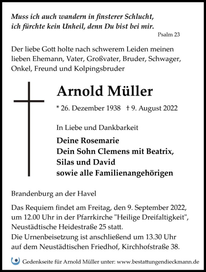 Liebe Frau Müller, Ihnen und Ihrer Familie möchten wir unser aufrichtiges Beileid aussprechen zum Tode Ihres Mannes. Wir wünschen Ihnen viel Kraft für die kommende Zeit und Gottes Segen. Wir behalten Ihren Mann gerne in Erinnerung, immer zu einem Spaß bereit war er.