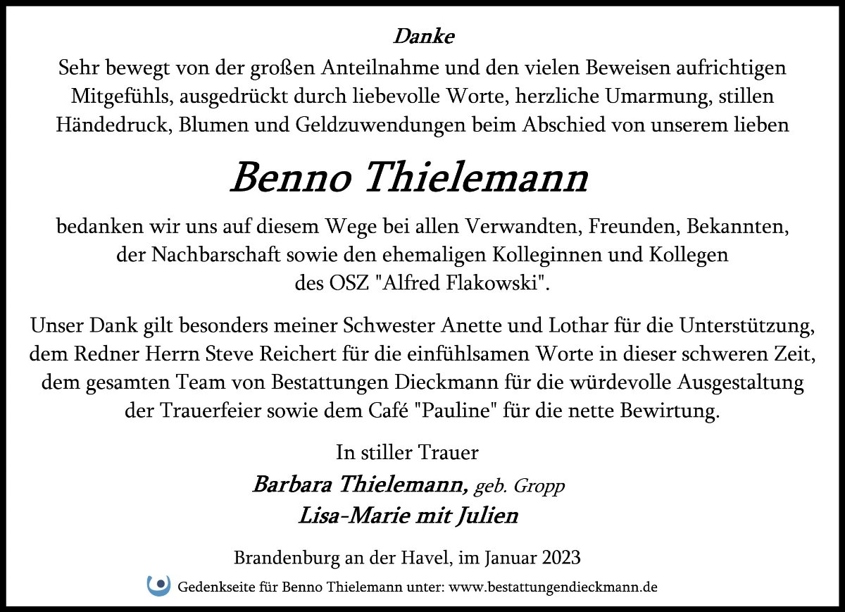 Werte Frau Thielemann! Zum Tode Ihres lieben Mannes bekunde ich Ihnen mein aufrichtiges Beileid. Ich werde Benno, den ich vor Jahrzehnten als Journalist beim DTSB kennenlernte, in bester Erinnerung behalten - als einen stets ausgeglichenen, ruhigen und gutmütigen Menschen. Gern denke ich auch an mehrere unserer Treffs zur Kaffeetafel bei Frau Kühne (u .a. mit Monika (geb.) Panknin zurück...