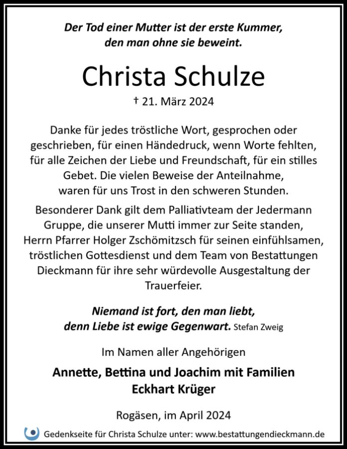 Christa Schulzegestorben am 21. März 2024
