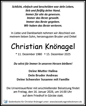 wir wünschen Ihnen für die kommende Zeit viel Kraft und dass es Ihnen gelingt, dankbar auf die positiven Erinnerungen zurückzublicken. Diese Gedenkseite möge Ihnen dabei helfen, Ihre Trauer zu teilen und das Andenken gemeinsam wachzuhalten.