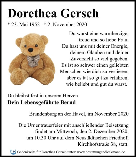 Dir Bernd, weiter viel Kraft und viele schöne Erinnerungen an die Zeit mit Dorothea.
