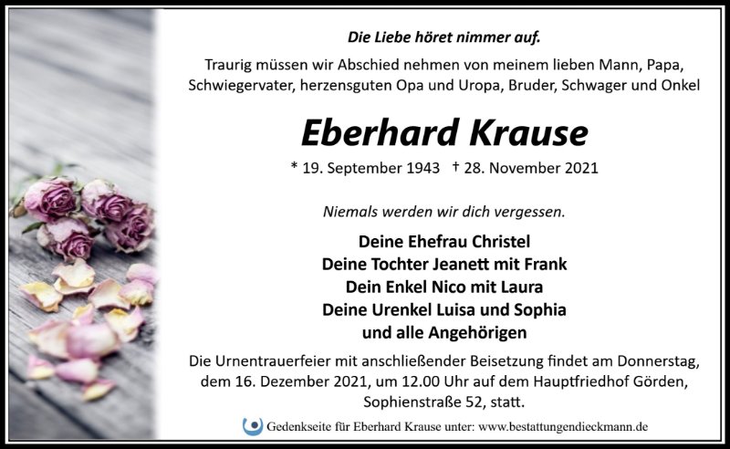 Wir umarmen euch ganz herzlich, mit der großen Gewissheit, dass er bei euch beiden die größte Lücke hinterlässt. Trauer muss ausgelebt werden, darum schämt euch nicht der Tränen … Ein lieber Mensch ist nicht mehr da, doch in euren und auch in unseren Herzen und Gedanken werden wir ihn nicht vergessen. Gern stehen wir euch jetzt und auch in Zukunft zur Seite, wenn ihr Hilfe, ein zuhörendes Ohr benötigt wird oder ihr nicht allein sein möchtet. Eberhard war ein herzensguter Mensch. Es wird so viele Gelegenheiten geben, wo wir ihn vermissen, über ihn erzählen und an ihn denken. Seine Krankheit hat ihn sehr viel Schmerzen bereitet. Gönnen wir ihn die Erlösung von diesen Schmerzen. Liebe Christel, bis zum Schluss warst du an seiner Seite und hast mitgelitten. Der Schmerz des Verlustes bleibt, doch Eberhard hat gewusst, dass er eine starke Frau hinterlässt, die auch ohne ihn das Leben meistern wird. Er war dir dankbar, für alles – liebe Christel – und das sollte dir die Kraft geben, mutig und auch zuversichtlich in die Zukunft zu blicken. Denk dran, du hast eine liebe Tochter, einen hilfsbereiten Schwiegersohn, einen tollen Enkel und besonders zwei ganz tolle, energiegeladene Urenkelkinder, die dir helfen und auch die dich brauchen.