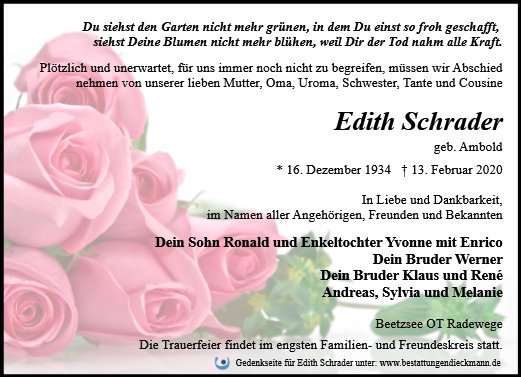 Es gibt wenige Menschen, die so bewundernswert stark und mit so viel Kraft, durchs Leben gehen, wie unsere Edith. So plötzlich hat sie uns jetzt auch einfach verlassen. Ihr werdet ihre Liebe und aufopfernde Begleitung im Leben immer vermissen, aber irgendwo und irgendwie wird sie immer bei euch sein. Der Schmerz wird etwas weniger, der Verlust eurer lieben Mutti, Oma und Uroma bleibt.