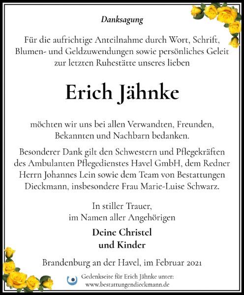 in diesen Tagen fühlen wir mit Ihnen und wünschen Ihnen von Herzen, dass Sie aus den glücklichen Erinnerungen Kraft schöpfen, um positiv in die Zukunft zu gehen. Diese Gedenkseite möge Ihnen dabei helfen, Ihre Trauer zu teilen und das Andenken gemeinsam wachzuhalten.