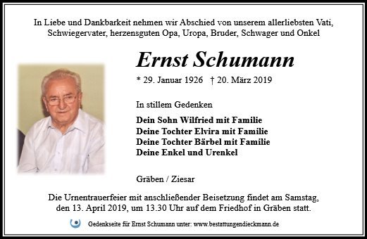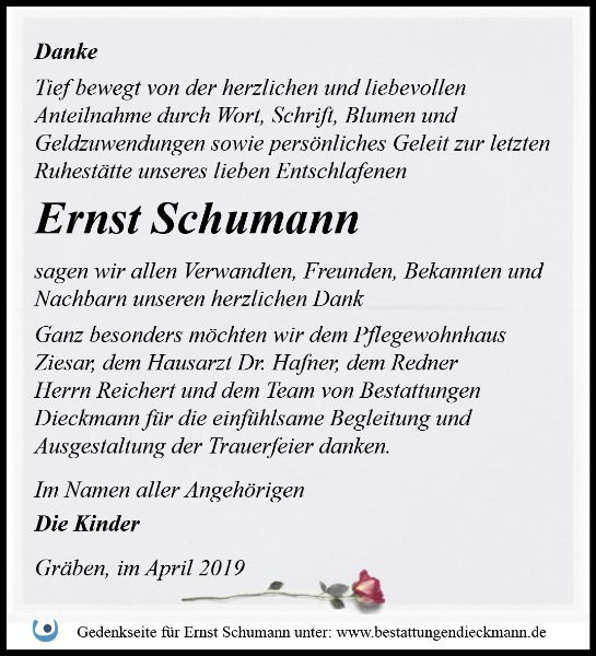 Mit dem Anzünden einer Kerze, dem schreiben von persönlichen Zeilen oder das hochladen von Bildern aus vergangenen Zeiten, kann ein Jeder auf seine Art und Weise an Herrn Ernst Schumann gedenken. So werden die vielen unterschiedlichen Gedanken weiter getragen und die Erinnerungen bleiben im Kreise der Familie und Ihrer Freunde erhalten.