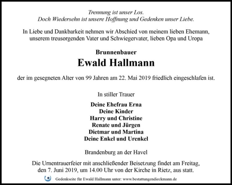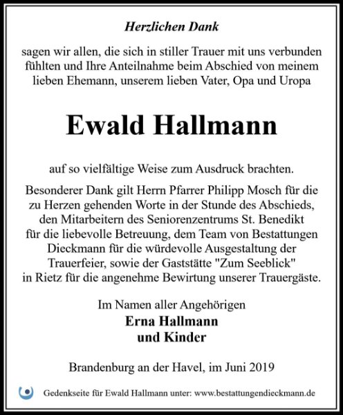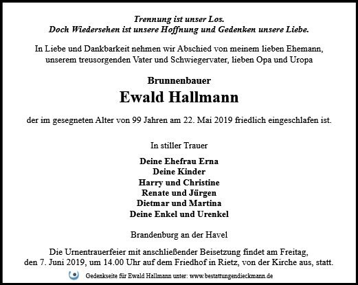 Liebe Familie Hallmann.wir die Familie Kammann sprechen Euch unser Beileid aus.Wir denken noch an die Zeit,wo wir gemeinsam in einem Haus gewohnt haben.Aber Ihr wurdet nicht vergessen.Für Euch alles Gute.von Margitta und Rainer Kammann