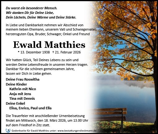 in diesen Tagen fühlen wir mit Ihnen und wünschen Ihnen von Herzen, dass Sie aus den glücklichen Erinnerungen Kraft schöpfen, um positiv in die Zukunft zu gehen. Diese Gedenkseite möge Ihnen dabei helfen, Ihre Trauer zu teilen und das Andenken gemeinsam wachzuhalten.