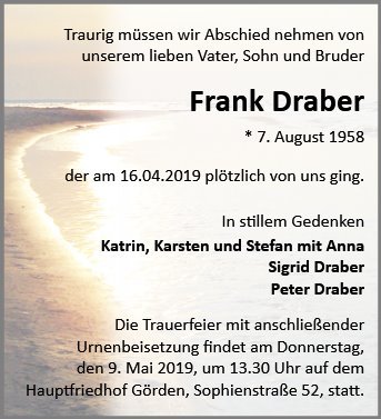 wir wünschen Ihnen von Herzen viel Kraft, dass Sie Menschen um sich haben, die Ihnen in dieser schweren Zeit beistehen und Halt geben. Zusätzlich können Sie auf dieser Gedenkseite Erinnerungen teilen und so das Andenken gemeinsam wachhalten.
