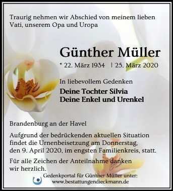 Wir wünschen Ihnen von Herzen viel Kraft, dass Sie Menschen um sich haben, die Ihnen in dieser schweren Zeit beistehen und Halt geben. Zusätzlich können Sie auf dieser Gedenkseite Erinnerungen teilen und so das Andenken gemeinsam wachhalten.