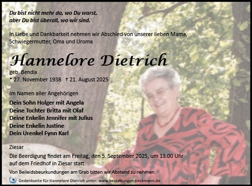 es ist so schwer dich gehen zu lassen. Gestern brachten wir dich zur letzten Ruhestätte, wo auch Vati vor 9 Jahren seine letzte Ruhe fand. Ihr seit nun wieder vereint. Irgendwann sehen wir uns wieder. Bis dahin werde ich euch nicht vergessen und tief in meinem Herzen tragen. Ich hab euch beide lieb. Du fehlst mir Mutti, ich hab dich lieb. Danke für alles.