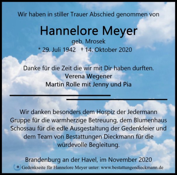 Hannelore Meyergestorben am 14. Oktober 2020