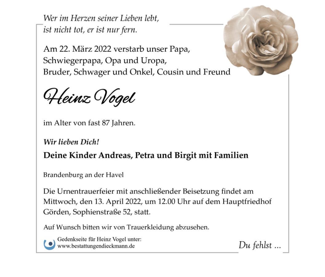 in dieser Zeit des Schmerzes wünschen wir Ihnen Kraft, den Verlust im Kreise Ihrer Liebsten zu verarbeiten. Als Zeichen unserer Anteilnahme und des Gedenkens entzünden wir dieses erste Licht. Möge diese Gedenkseite Ihnen helfen, Erinnerungen zu teilen und so das Andenken gemeinsam wachzuhalten.