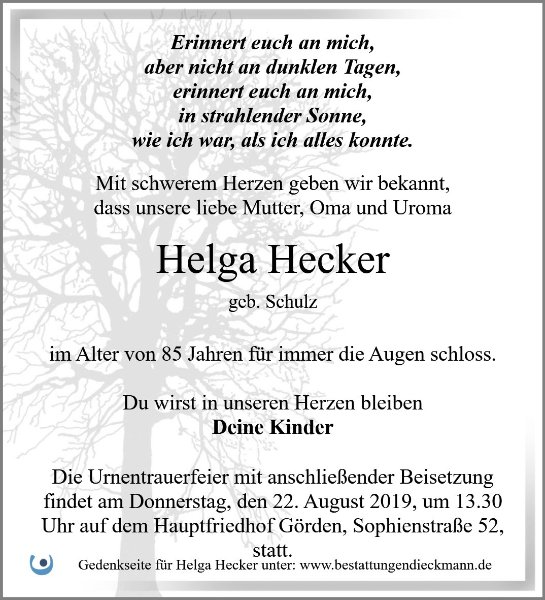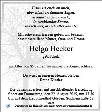 Voll Dankbarkeit für alle Liebe und Fürsorge die sie uns in ihrem Leben schenkte, nehmen wir Abschied von unserer Mutter.Es ist so schwer ,zu verstehen, dass wir uns nicht mehr wiedersehen.Ruhe in Frieden. Deine Kinder