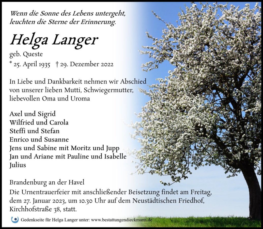 Helga Langergestorben am 29. Dezember 2022