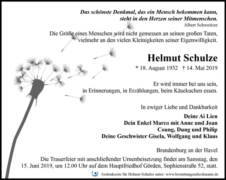 in dieser Zeit des Schmerzes wünschen wir Dir und Ihnen Kraft, den Verlust von Opa Helmut zu verarbeiten. Als Zeichen unserer Anteilnahme und des Gedenkens entzünden wir dieses erste Licht. Möge diese Gedenkseite helfen, Erinnerungen zu teilen und so das Andenken gemeinsam wachzuhalten.