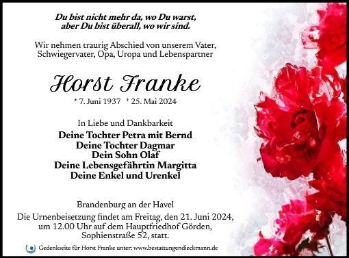 wir wünschen Ihnen für die kommende Zeit viel Kraft und dass es Ihnen gelingt, dankbar auf die positiven Erinnerungen zurückzublicken. Diese Gedenkseite möge Ihnen dabei helfen, Ihre Trauer zu teilen und das Andenken gemeinsam wachzuhalten.