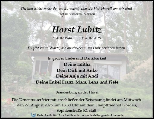 in dieser Zeit des Schmerzes wünschen wir Ihnen Kraft, den Verlust im Kreise Ihrer Liebsten zu verarbeiten. Als Zeichen unserer Anteilnahme und des Gedenkens entzünden wir dieses erste Licht. Möge diese Gedenkseite Ihnen helfen, Erinnerungen zu teilen und so das Andenken gemeinsam wachzuhalten.
