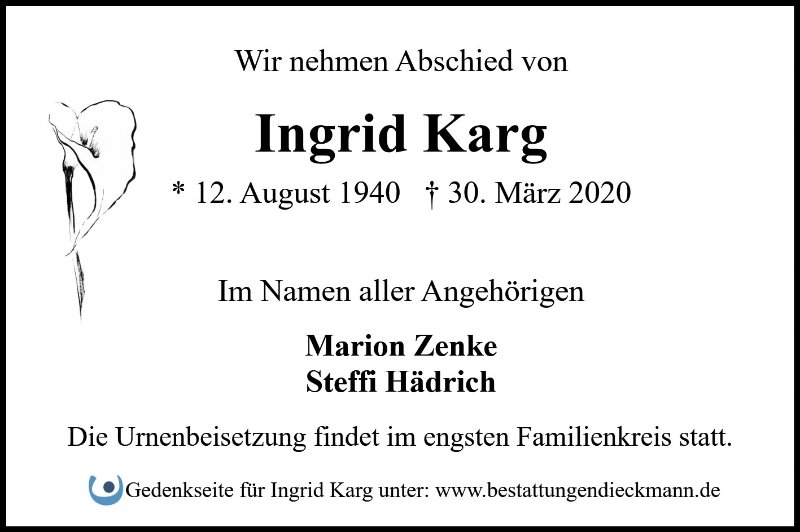 Ingrid Karggestorben am 30. März 2020