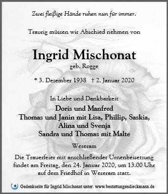 Niemand kann Ihnen den damit verbundenen Schmerz abnehmen, aber für diese Zeit hoffe ich, dass diese Gedenkseite dazu beiträgt, gemeinsame Erinnerungen zu teilen. Fortan verbinden nur die Erinnerungen an Ihrer lieben Verstorbenen, an Erlebnisse die Sie gemeinsam hatten. Lassen Sie diese Erinnerungen und Gedanken aufleben, indem Sie eine Kerze anzünden, Bilder hochladen oder persönliche Worte schreiben.