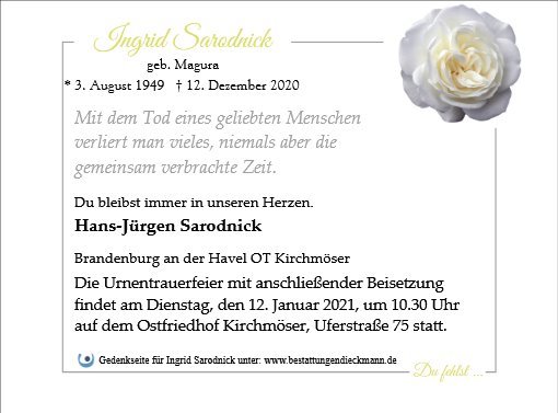 wir wünschen Ihnen für die kommende Zeit viel Kraft und dass es Ihnen gelingt, dankbar auf die positiven Erinnerungen zurückzublicken. Diese Gedenkseite möge Ihnen dabei helfen, Ihre Trauer zu teilen und das Andenken gemeinsam wachzuhalten.