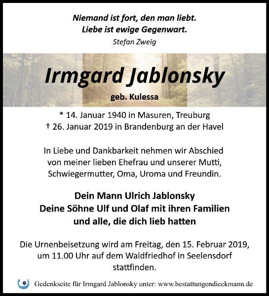 wir wünschen Ihnen für die kommende Zeit viel Kraft und dass es Ihnen gelingt, dankbar auf die positiven Erinnerungen zurückzublicken. Diese Gedenkseite möge Ihnen dabei helfen, Ihre Trauer zu teilen und das Andenken gemeinsam wachzuhalten.