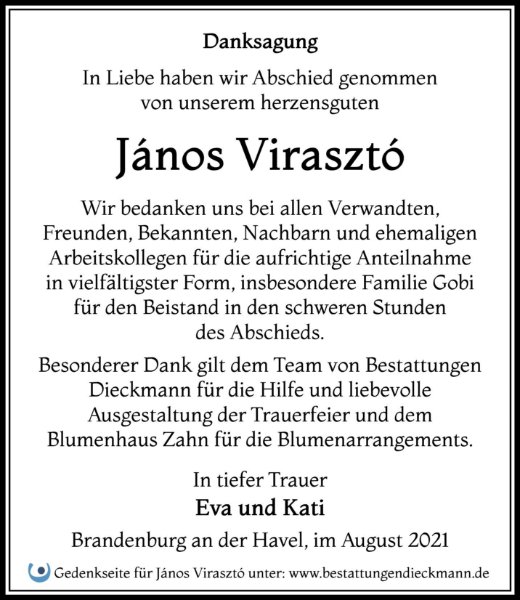 Tief erschüttert haben wir die Nachricht vom ableben von deinen lieben Mann Janos gelesen unser aufrichtiges Beileid