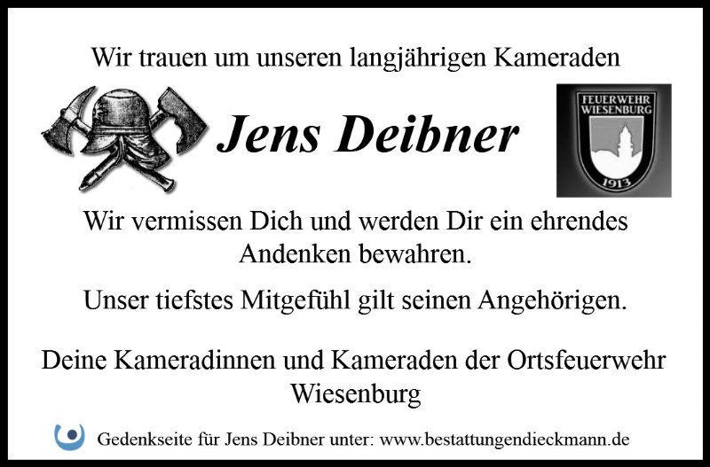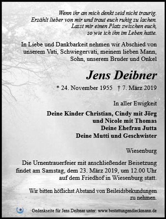 Mit dem Anzünden einer Kerze, dem schreiben von persönlichen Zeilen oder das hochladen von Bildern aus vergangenen Zeiten, kann ein Jeder auf seine Art und Weise an Herrn Jens Deibner gedenken. So werden die vielen unterschiedlichen Gedanken weiter getragen und die Erinnerungen bleiben im Kreise der Familie und Ihrer Freunde erhalten.