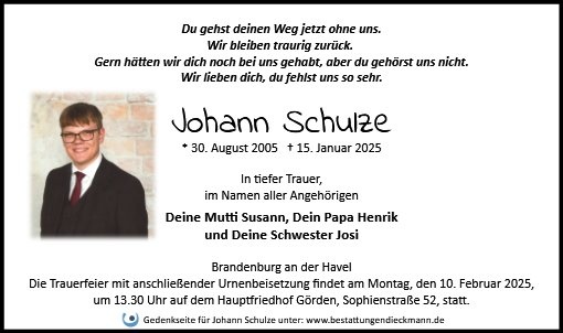 wir sind tief betroffen über den Tod Ihres Sohnes Johann und möchten Ihnen unser aufrichtiges Mitgefühl übermitteln.