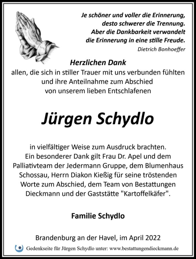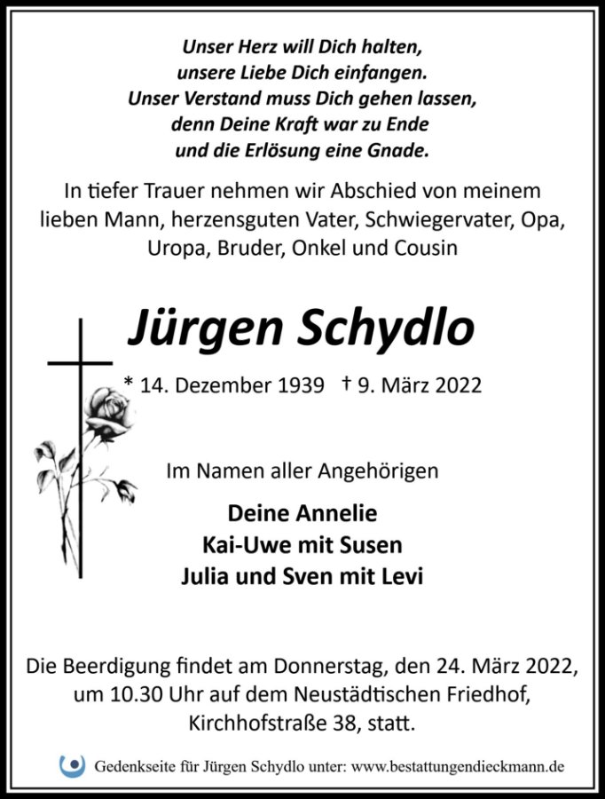 Werte Frau Schydlo,wir trauern mit Ihnen.Wir möchten Ihnen auf diesem Wege unser herzliches Beileid ausdrücken.