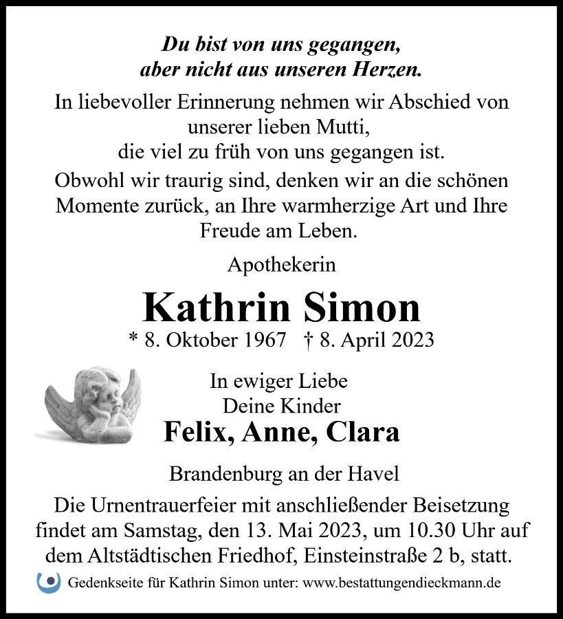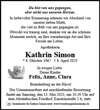 Liebe Kathrin, wenn auch erst etwas später, einige Worte von mir. Wir sind uns damals in der Heilpraktikerausbildung begegnet, hatten immer tolle Gespräche, du warst eine tolle und inspirierende Frau und hast immer das Beste gegeben. Lieber Felix, liebe Clara und liebe Anne, eins sei gewiss eure Mama war immer stolz auf euch und hat immer beide Hände schützend über euch gehalten. Ich wünsche euch viel Kraft weiterhin den Verlust zu verstehen und zu verarbeiten.