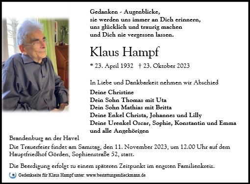 Klaus war an der Erweiterten Oberschule Johann Wolfgang von Goethe über nahezu 25 Jahre mein Kollege. Zwar hatte ich als Germanist und Slawist mit ihm als Physiker und Mathematiker rein fachlich kaum Kontakte, aber ich schätzte sein ruhiges, zurückhaltendes Wesen, seinen feinen Humor, ja, auch seine mitunter aufblitzende dezente Ironie. Er war ein liebenswerter Mensch, und er war im guten Sinne ein Lehrer alter Schule. Klaus Hampf hat sich verabschiedet, ich behalte ihn gerne in freundlicher Erinnerung.