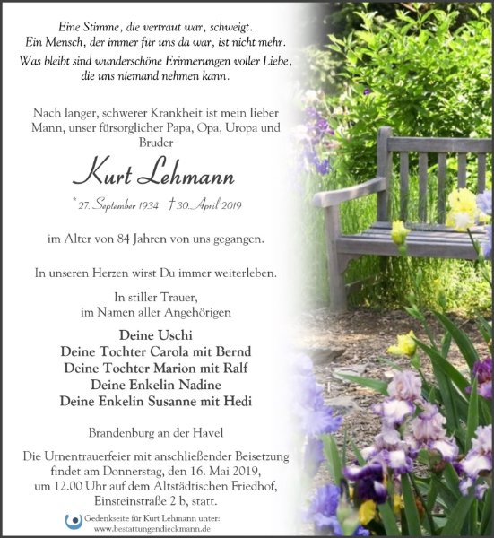 Niemand kann Ihnen den damit verbundenen Schmerz abnehmen, aber für diese Zeit hoffe ich, dass diese Gedenkseite dazu beiträgt, gemeinsame Erinnerungen zu teilen. Fortan verbinden nur die Erinnerungen an Ihren lieben Verstorbenen, an Erlebnisse die Sie gemeinsam hatten. Lassen Sie diese Erinnerungen und Gedanken aufleben, indem Sie eine Kerze anzünden, Bilder hochladen oder persönliche Worte schreiben.