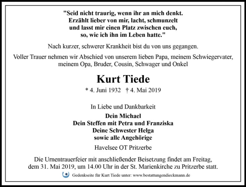 wir wünschen Ihnen für die kommende Zeit viel Kraft und dass es Ihnen gelingt, dankbar auf die positiven Erinnerungen zurückzublicken. Diese Gedenkseite möge Ihnen dabei helfen, Ihre Trauer zu teilen und das Andenken gemeinsam wachzuhalten.