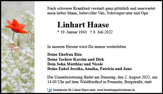 wir wünschen Ihnen für die kommende Zeit viel Kraft und dass es Ihnen gelingt, dankbar auf die positiven Erinnerungen zurückzublicken. Diese Gedenkseite möge Ihnen dabei helfen, Ihre Trauer zu teilen und das Andenken gemeinsam wachzuhalten.
