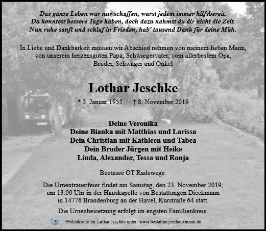 Lieber Lothar,wir denken heute besonders an dich .Heute müsstet Du eigentlich deinen 65 Geburtstag feiern.Wir vermissen dich.Dietmar,Sigrid,Kinder und Enkel