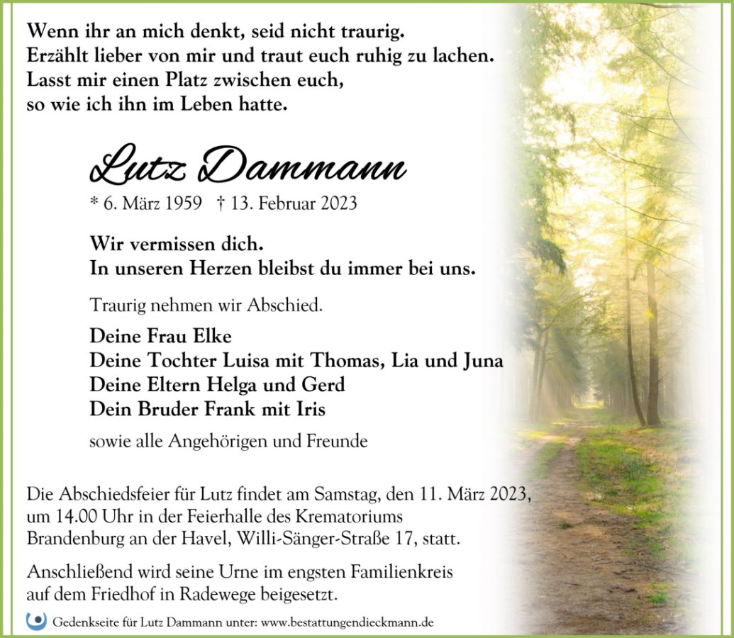 Liebe Elke, dir und deinen Angehörigen sprechen wir auf diesem Weg unser aufrichtiges Beileid aus. Wir werden Lutz stets in guter Erinnerung behalten. Er war ein lebensbejahender Mensch, der stets einen flotten Spruch auf den Lippen hatte. So auch im Herbst 2022 an der Ablage in Radewege, als wir uns zufällig trafen. Wir wünschen dir viel Kraft in diesen schweren Stunden. Es grüßen dich herzlich
