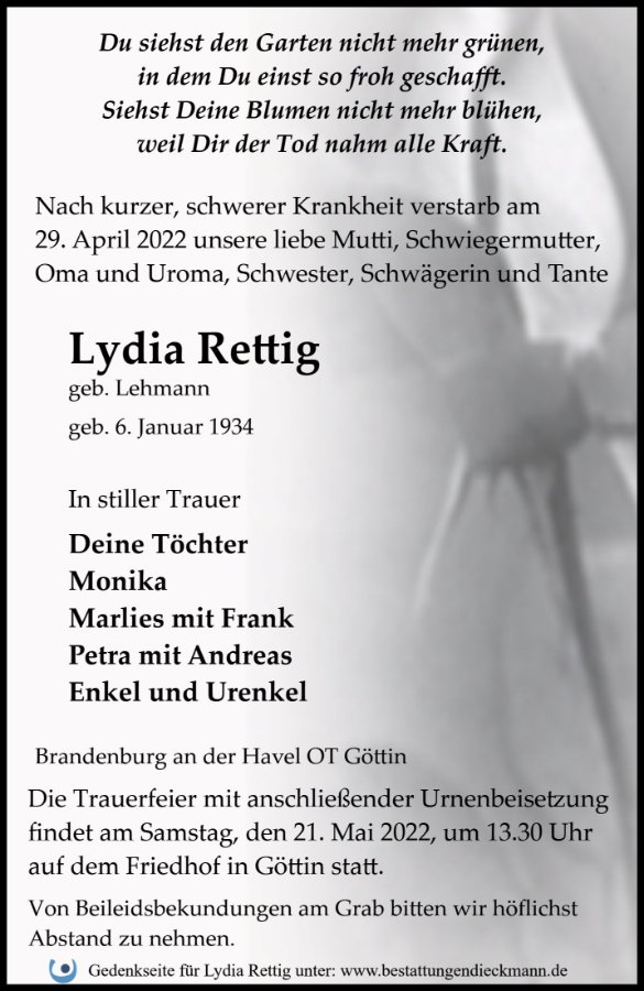 gestorben am 29. April 2022 in Brandenburg an der Havel OT Göttin