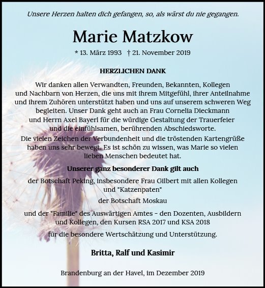 Ich weiss nicht recht, wie ich anfangen soll. Als erstes, es tut mir leid Britta, Ralf und Kasimir, dass ich jetzt erst mit euch trauere. Ich hab zwar recht zeitnah davon erfahren, und doch mich nicht durchgerungen mein Mitgefühl zu bekunden, obwohl ihr eine solch schwere Zeit durchmachen musstet. Immerhin wart ihr damals immer so freundlich und nett zu mir. Ich wünsche euch alle Stärke der Welt.