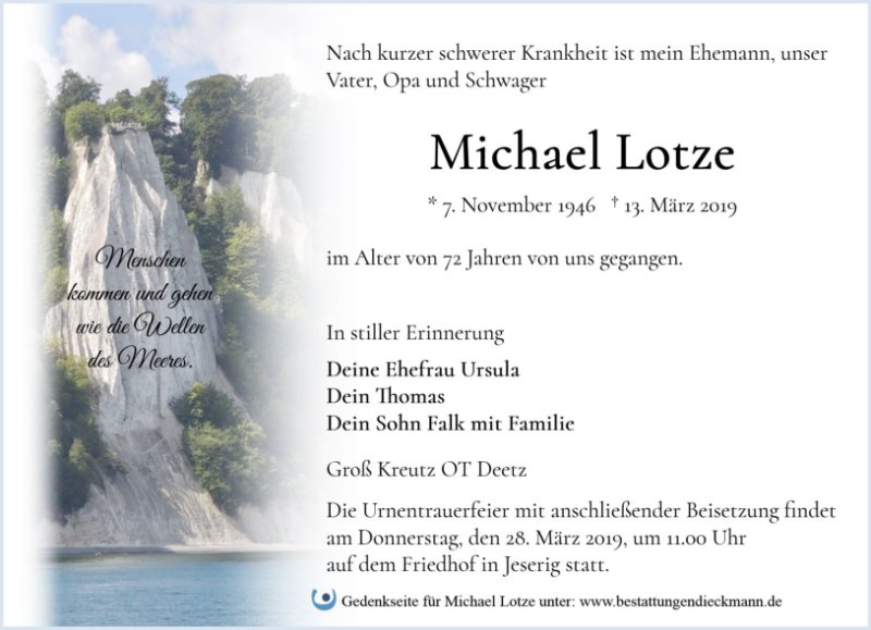Mit dem Anzünden einer Kerze, dem schreiben von persönlichen Zeilen oder das hochladen von Bildern aus vergangenen Zeiten, kann ein Jeder auf seine Art und Weise an Herrn Lotze gedenken. So werden die vielen unterschiedlichen Gedanken weiter getragen und die Erinnerungen bleiben im Kreise der Familie und Ihrer Freunde erhalten.