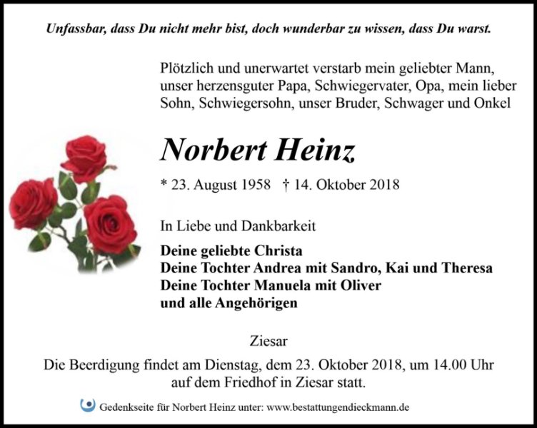Sicher weiß ich,dass du liebe Christa dies hier lesen wirst und nicht Norbert, aber das Gefühl zu haben , irgendwie sich was von der Seele zu schreiben und so auf diese Weise mit unseren Lieben eine Verbindung zu schaffen,tut einfach gut.