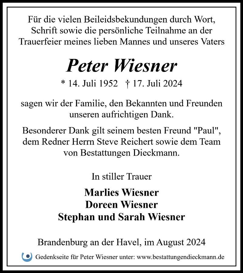 wir wünschen Ihnen von Herzen viel Kraft, dass Sie Menschen um sich haben, die Ihnen in dieser schweren Zeit beistehen und Halt geben. Zusätzlich können Sie auf dieser Gedenkseite Erinnerungen teilen und so das Andenken gemeinsam wachhalten.