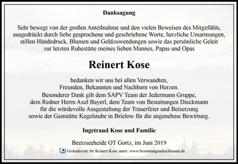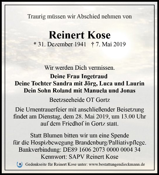 Reinert Kosegestorben am 7. Mai 2019