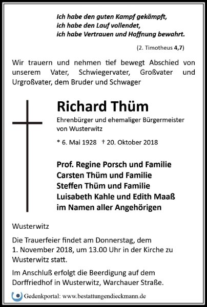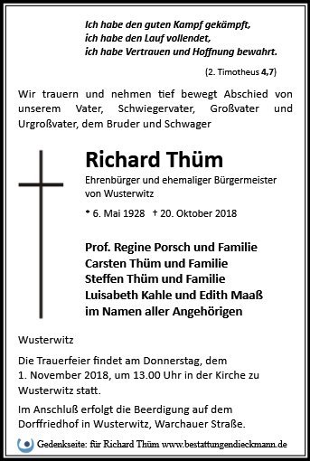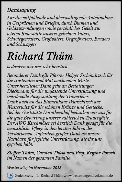 Mit großer Bestürzung habe ich erst jetzt vom Tod von Herrn Richard Thüm erfahren.