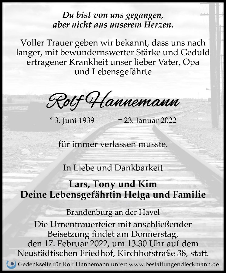 In Gedanken an Rolf und Euch sind wir am 17.02.2022 bei seiner letzten Reise dabei, wünschen Euch viel Kraft.
